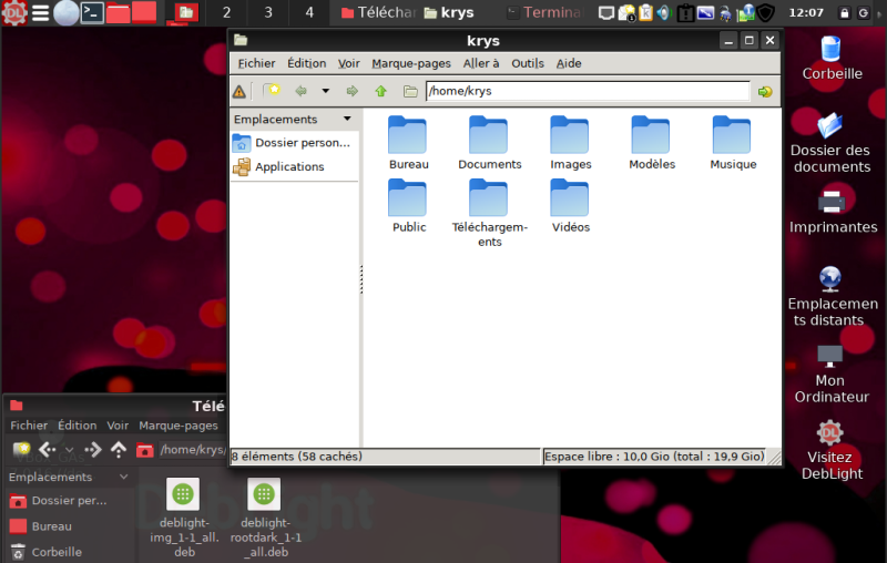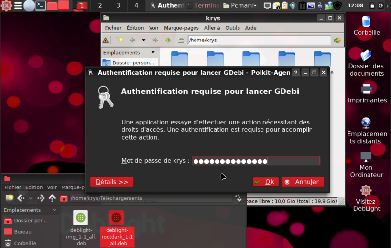 Une fois l'installation finie, on re ouvre une fenêtre de PCManFM en mode root. On constate qu'elle est enfin dans le thème dark de DebLight OS. Il en va de même pour Xed, l'éditeur de texte.