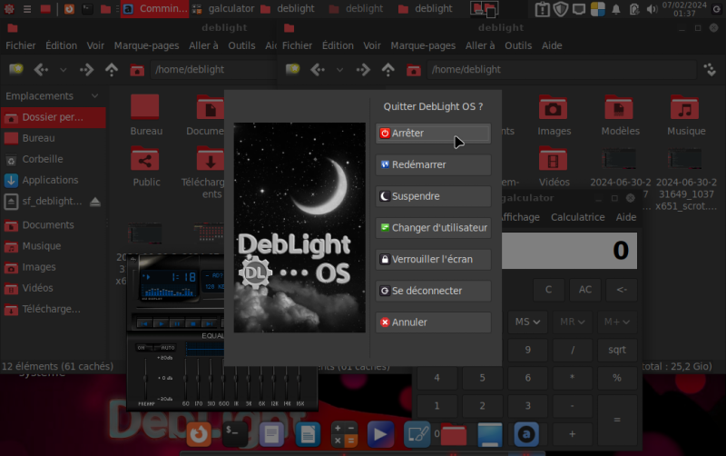 Menu d'arrêt, PCManFM, Audacious, Galculator |