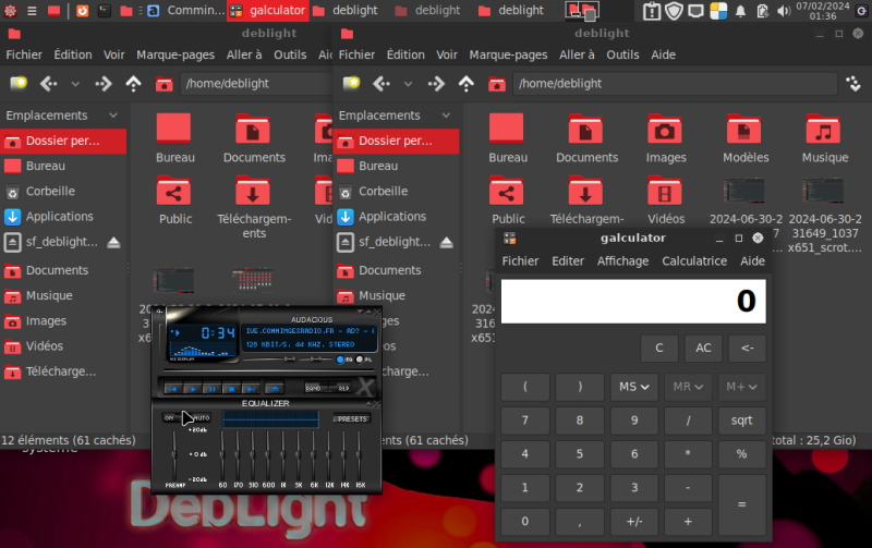 Gestionnaire de fichiers PCManFM, Audacious (Winamp), Galculator |