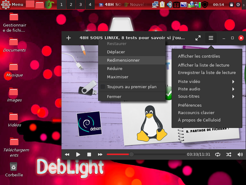 Le player audio/vidéo Celluloid avec les menus |